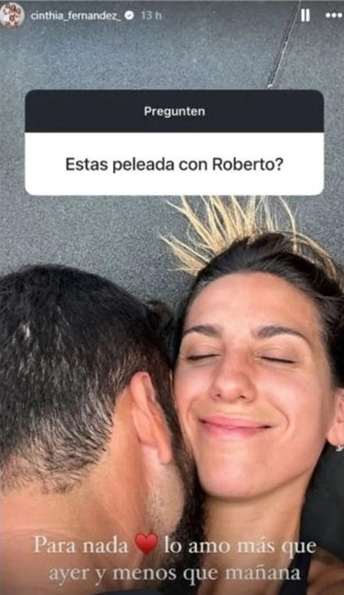"La verdad, mostré poco porque estaba preocupada por mi quiste y además, tengo mucho trabajo", comenzó a explicar Cinthia Fernández, luego se ocupó de responder a un seguidor que utilizó la cajita de preguntas de Instagram habilitada por la mediática. "No estoy peleada para nada. Lo amo más que ayer y menos que mañana", contestó muy segura anexando una foto romántica con su novio.