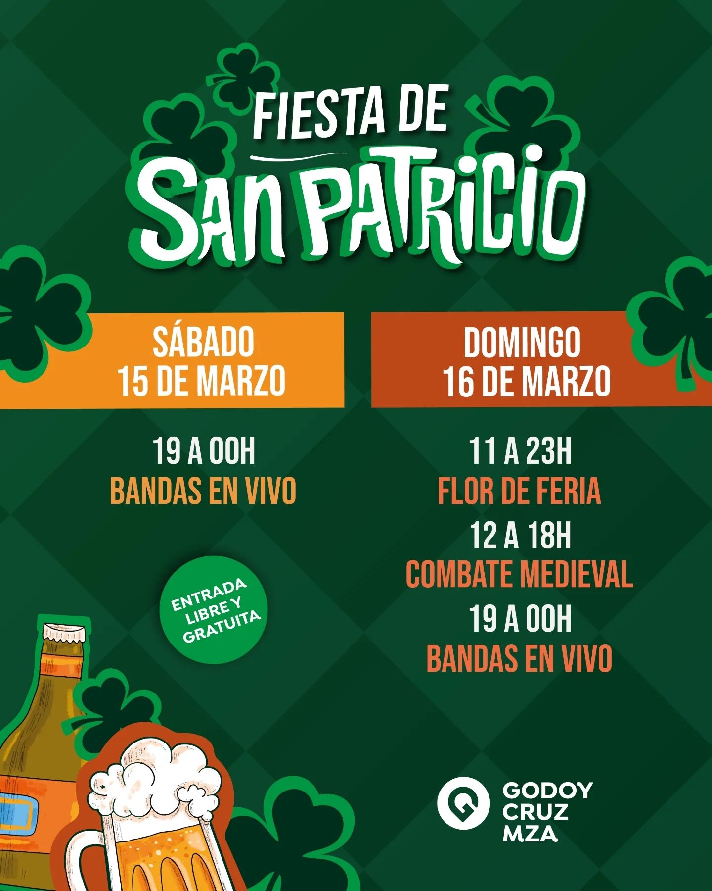 Este fin de semana, el Espacio Verde Luis Menotti Pescarmona en Godoy Cruz se vestirá de colores irlandeses para celebrar la Fiesta de San Patricio los días sábado 15 y domingo 16 de marzo. El sábado, el festival se iniciará a las 19, mientras que el domingo ya habrá actividades desde las 11.La propuesta incluye una variada lista de artistas mendocinos que estarán tocando en el escenario durante el fin de semana.