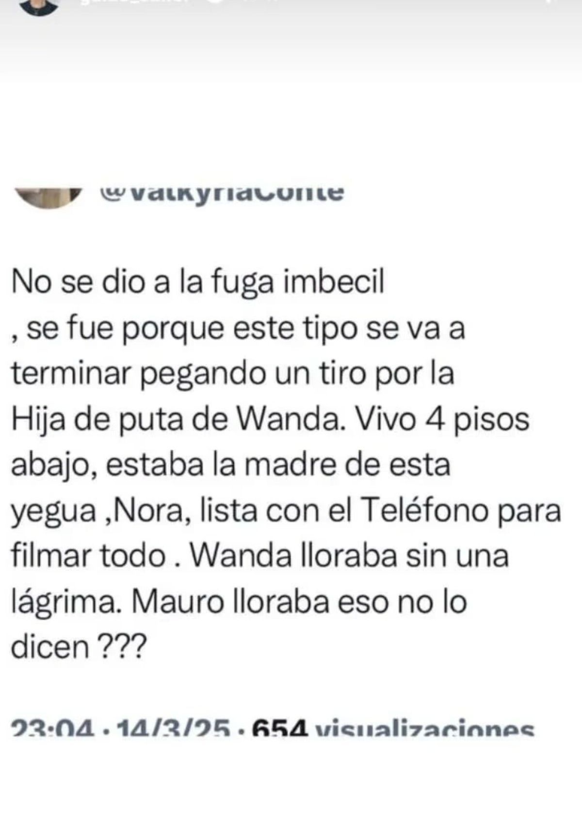 "No se dio a la fuga, imbécil. Se fue porque este tipo se va terminar pegando un tiro por la hija de pu... de Wanda. Vivo 4 pisos abajo, estaba la madre de esta yegua, Nora, lista con el teléfono para filmar todo. Wanda llorando sin una lágrima. Mauro lloraba, eso no lo dicen", asegura el relato que reposteó Guido Süller sobre el conflicto entre Mauro Icardi y Wanda Nara.
