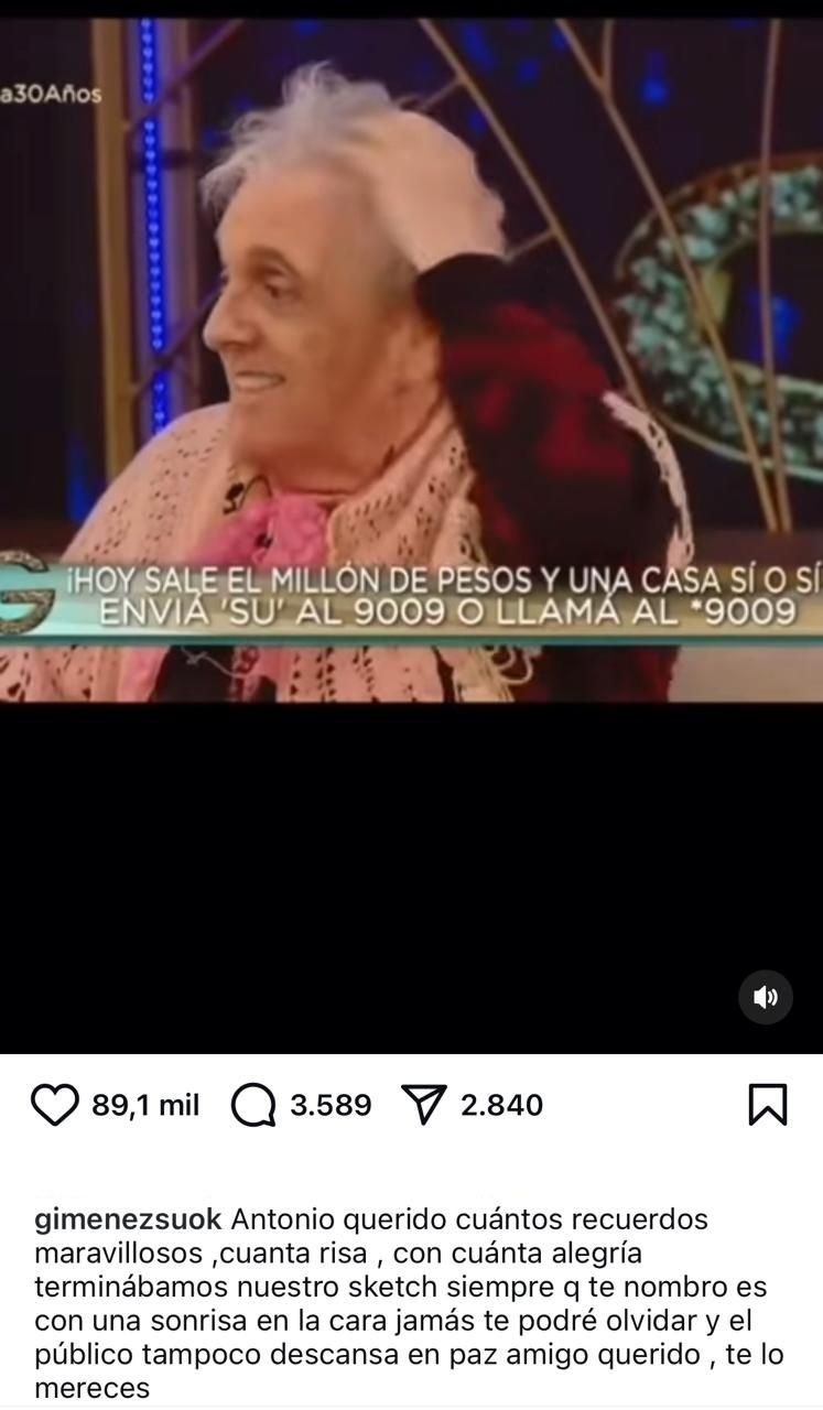 "Antonio querido, cuántos recuerdos maravillosos, cuanta risa, con cuánta alegría terminábamos nuestro sketch. Siempre que te nombro es con una sonrisa en la cara. Jamás te podré olvidar y el publico tampoco. Descansa en paz, amigo querido, te lo mereces", expresó Susana Giménez.
