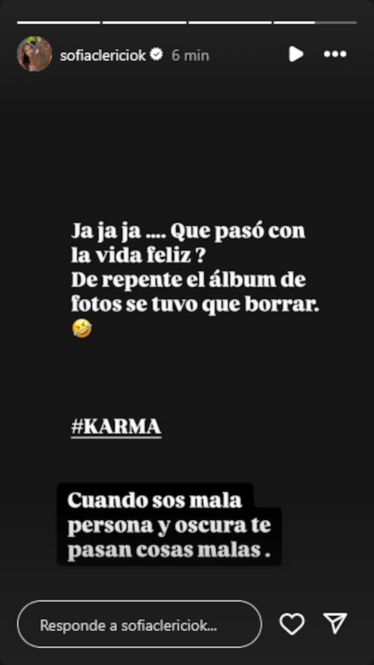En el mismo posteo recordó el conflicto que las involucró en el yategate con Insaurralde y añadió: “Karma. Cuando sos mala persona y oscura te pasan cosas malas”. Sin embargo, en poco tiempo más de una hora, eliminó la publicación que apuntaba a Jésica Cirio.