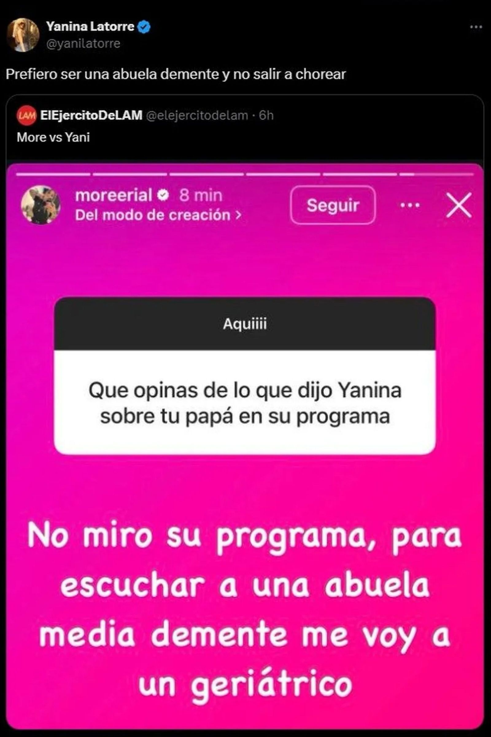 Esta vez, Morena defenestró a Yanina Latorre. Todo empezó cuando, mediante una historia de Instagram, un seguidor le preguntó a Morena qué opinaba lo que habían dicho sobre su padre en el nuevo programa de Yanina Latorre, Sálvese Quien Pueda (América). "No miro su programa, para escuchar a una abuela medio demente me voy a un geriátrico", fue la respuesta de la influencer.