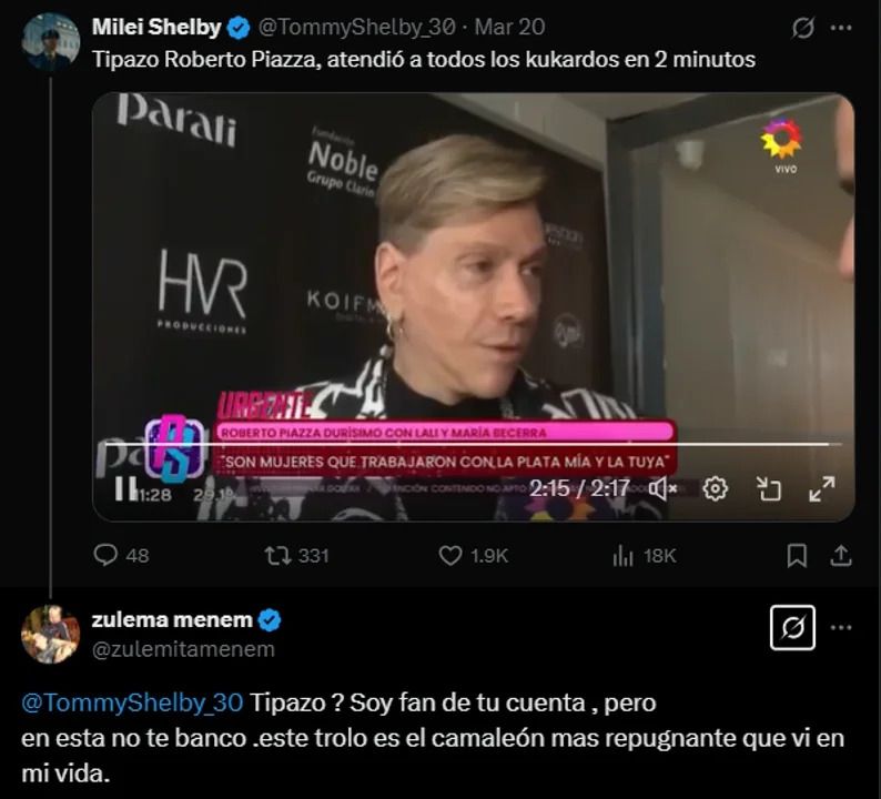 A lo que Zulemita Menem de una manera incisiva y con una connotación homofóbica respondió: “¿Tipazo? Soy fan de tu cuenta, pero en esta no te banco. Este trolo es el camaleón más repugnante que vi en mi vida”. Junto al lapidario mensaje sumó capturas de notas periodísticas de 2010 cuando Roberto Piazza le solicitaba a la ex Presidenta Cristina Fernández que auspicie como madrina de bodas. Ante esto, el seguidor libertario sólo respondió: “Genia Zulema, no tenía esa data”.