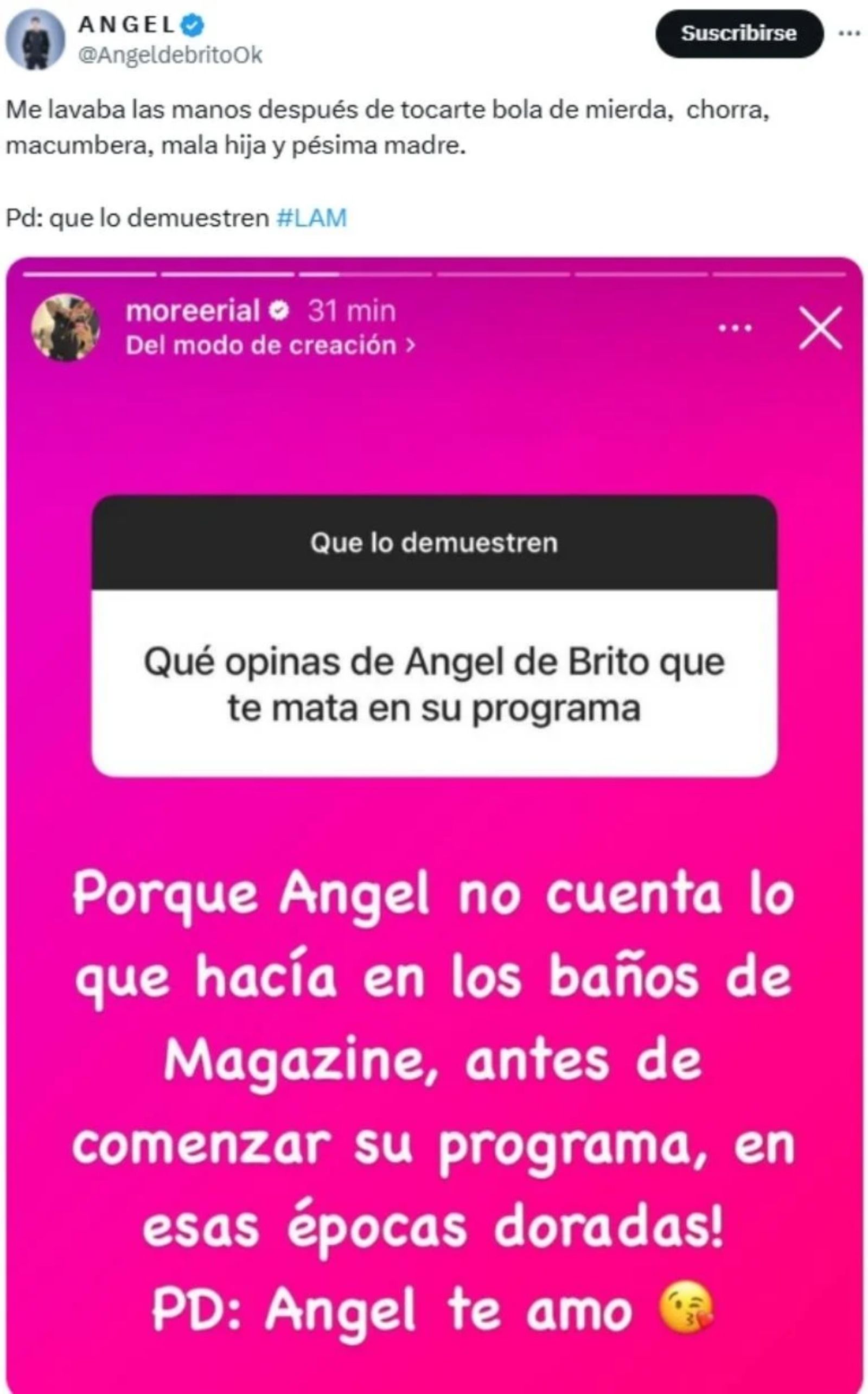 "¿Qué opinas de Ángel de Brito que te mata en su programa?", fue la pregunta que le llegó de un seguidor. "Por qué Ángel no cuenta lo que hacía en los baños de Magazine, antes de comenzar su programa, ¡en esas épocas doradas! PD: Ángel, te amo", contestó la hija de Jorge Rial muy picante.
