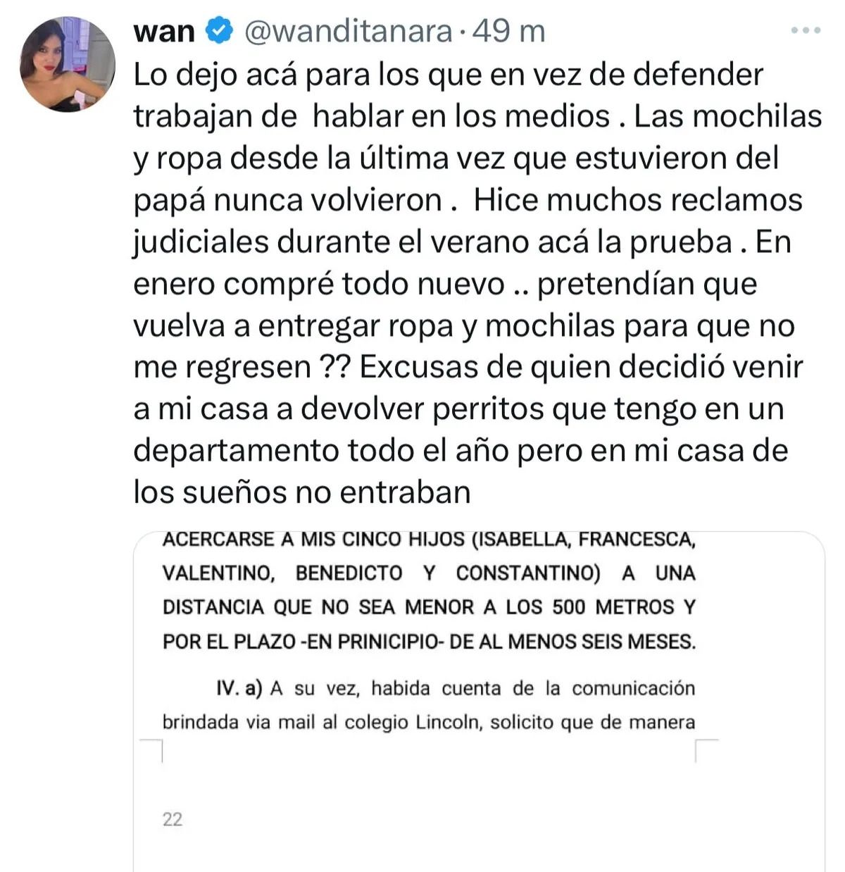 Respecto a las dos abogadas que defendieron a Icardi públicamente, Wanda señaló: “Me molestó que digan que mi hija no estaba enferma, que hice una emboscada y que hablo sobre violencia de género cuando hago denuncias que no son verdad y es mentira”.