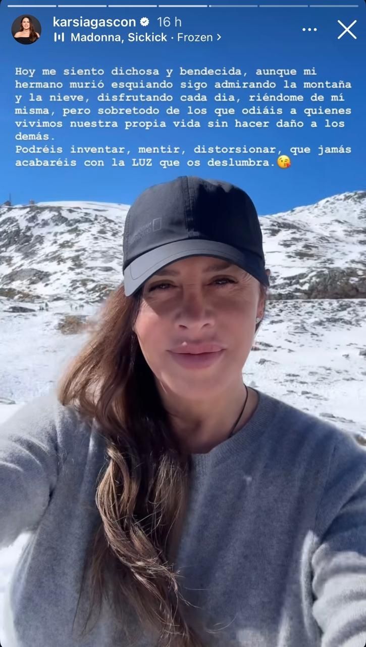 No obstante, más tarde, Karla eliminó aquella historia y la subió de nuevo, esta vez con un nuevo mensaje: "Hoy me siento dichosa y bendecida, aunque mi hermano murió esquiando sigo admirando la montaña y la nieve, disfrutando cada día, riéndome de mí misma, pero sobretodo de los que odiáis a quienes vivimos nuestra propia vida sin hacer daño a los demás. Podréis inventar, mentir, distorsionar, que jamás acabaréis con la LUZ que os deslumbra".
