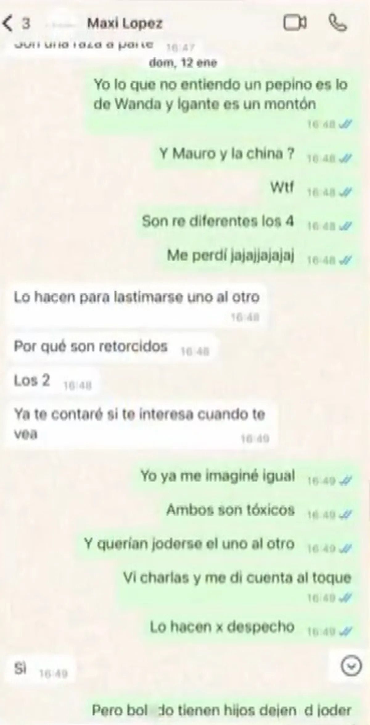 Otro de los polémicos mensajes que Maxi López le decía a Luah apuntaba: "Lo hacen para lastimarse uno al otro porque son retorcidos los dos. Ya te contaré si te interesa cuando te vea". La modelo continuó criticando a Wanda: "Las nenas de Wanda lo miraban a L-Gante re mal en su cumple, un asco".