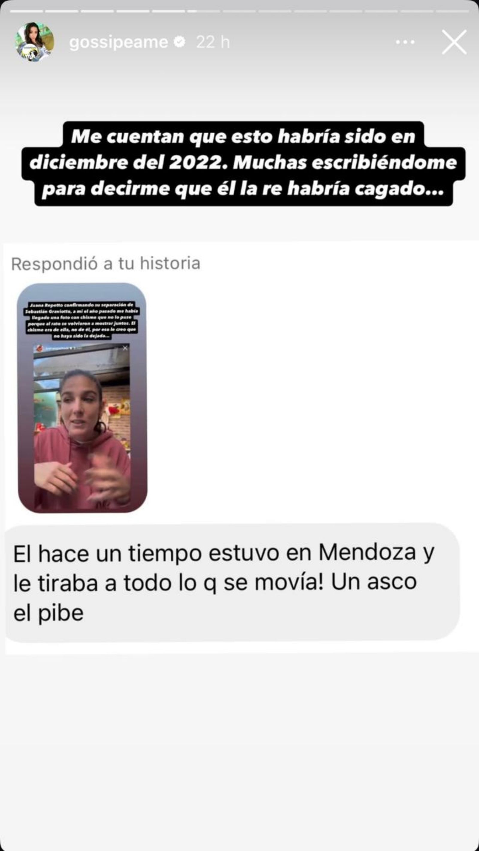 La periodista compartió en sus historias la información que le llegó de un seguidor, quien le contó lo que hizo Sebastián cuando estuvo en Mendoza en 2022 y se encontraba en pareja con la actriz.