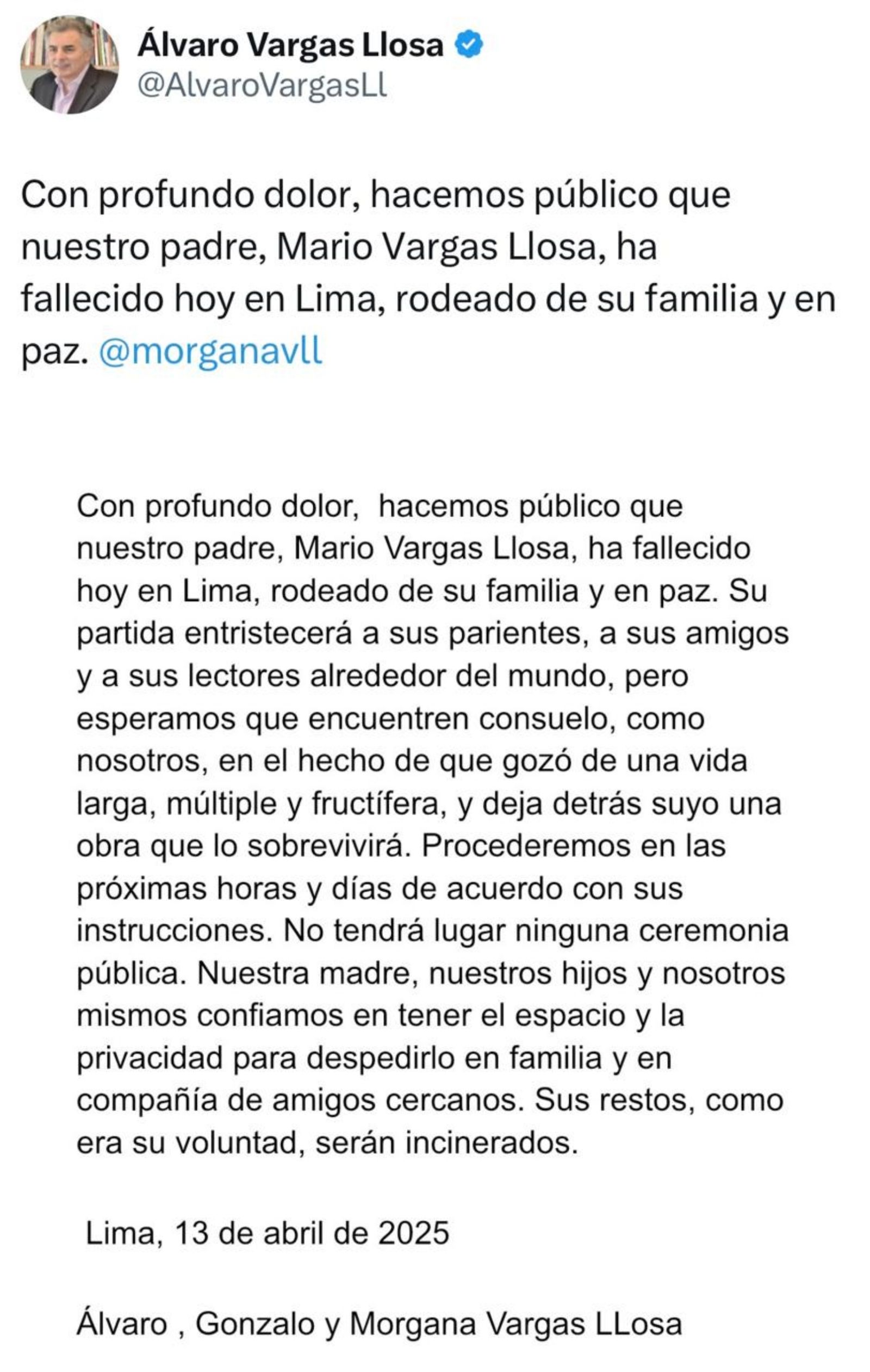 La noticia fue comunicada por sus hijos a través de las redes sociales. "Con profundo dolor, hacemos público que nuestro padre, Mario Vargas Llosa, ha fallecido hoy en Lima, rodeado de su familia y en paz. Su partida entristecerá a sus parientes, a sus amigos y a sus lectores alrededor del mundo, pero esperamos que encuentren consuelo, como nosotros, en el hecho de que gozó de una vida larga, múltiple y fructífera, y deja detrás suyo una obra que lo sobrevivirá", comienza diciendo el mensaje publicado por Álvaro Vargas Llosa, el hijo mayor del periodista.
