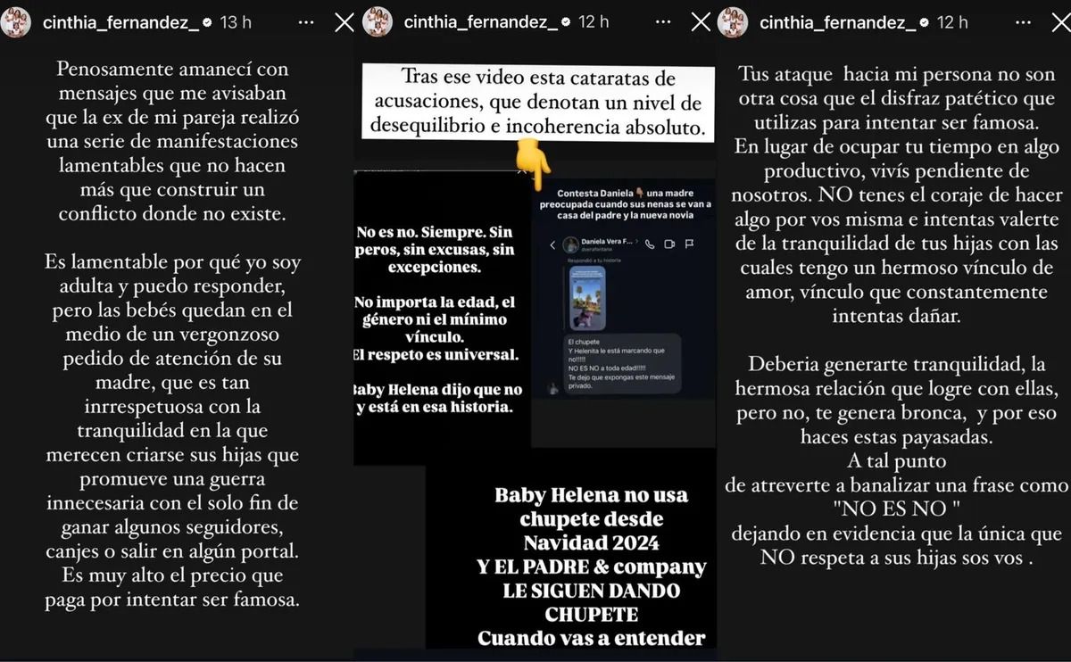 “Penosamente amanecí con mensajes que me avisaban que la ex de mi pareja realizó una serie de manifestaciones lamentables que no hacen más que construir un conflicto donde no existe”, inició su descargo Cinthia Fernández en historias de Instagram. Continuando con su iracunda respuesta a la exesposa de Roberto Castillo, la modelo expresó: “Es lamentable porque yo soy adulta y puedo responder, pero las bebés quedan en el medio del vergonzoso pedido de atención de su madre, que es tan irrespetuosa con la tranquilidad en la que merecen criarse sus hijas, que promueve una guerra innecesaria con el solo fin de ganar algunos seguidores, canjes o salir en algún portal”.