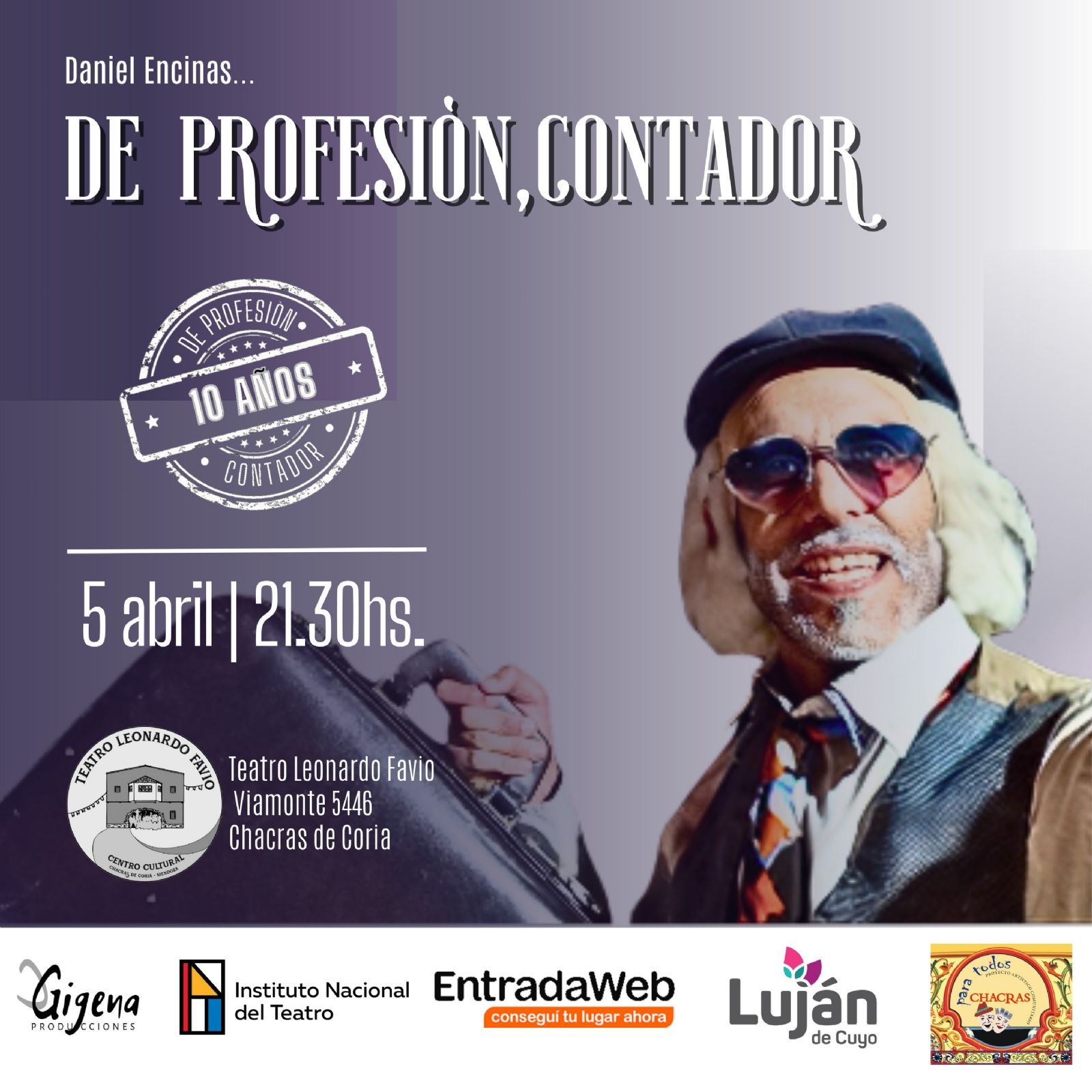 El reconocido unipersonal de Daniel Encinas, De Profesión Contador, celebra 10 años en escena. A lo largo del año, la obra recorrerá distintos departamentos de la provincia, y en abril llegará a Luján y Maipú.