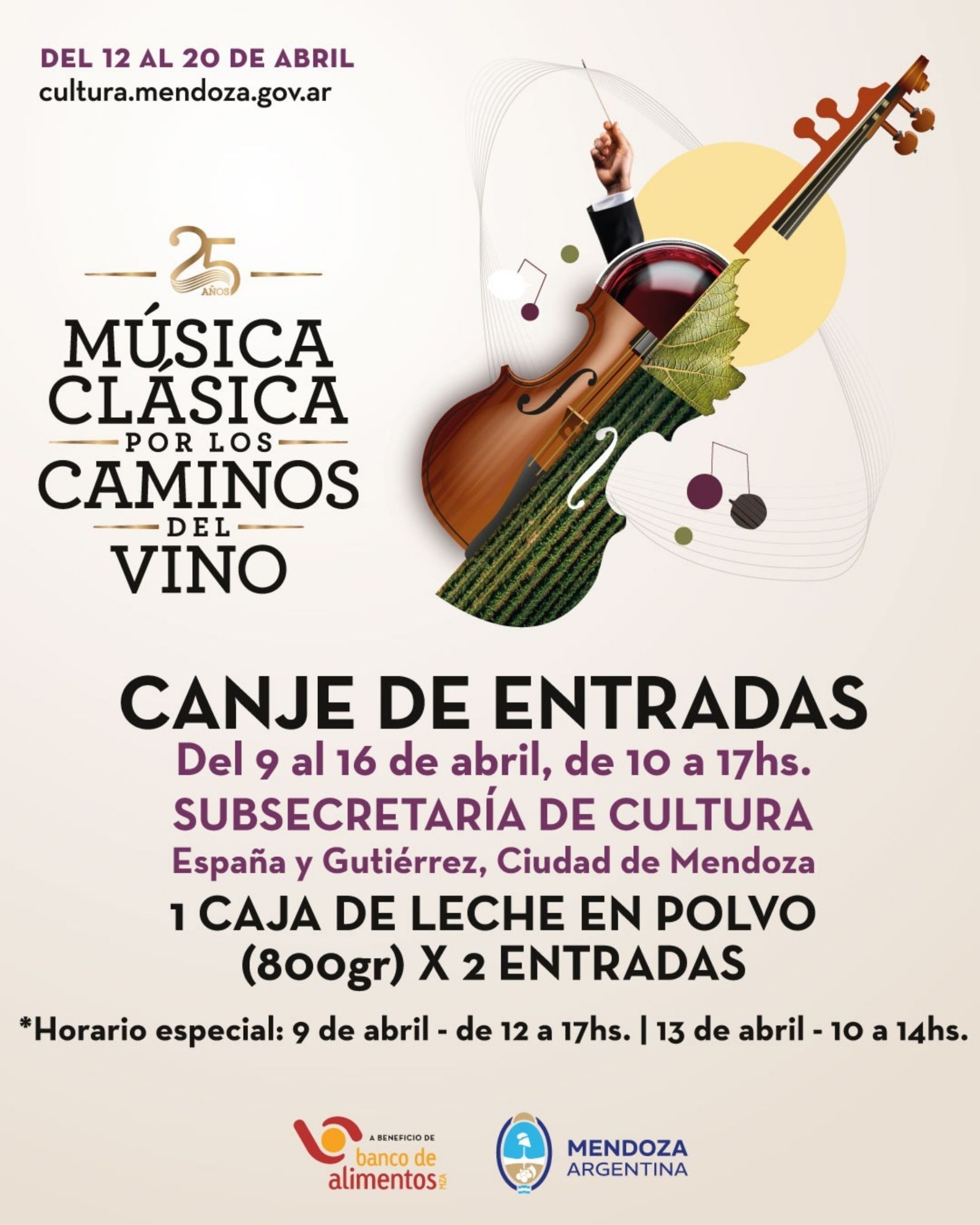 El evento será a beneficio del Banco de Alimentos de Mendoza y es por eso que existirá el canje de una caja de leche de 800 gramos por dos entradas. El canje se podrá realizar desde este miércoles 9 de abril hasta el miércoles 16 de 10 a 17 h en la Subsecretaría de Cultura (Gutiérrez 204, Ciudad).
