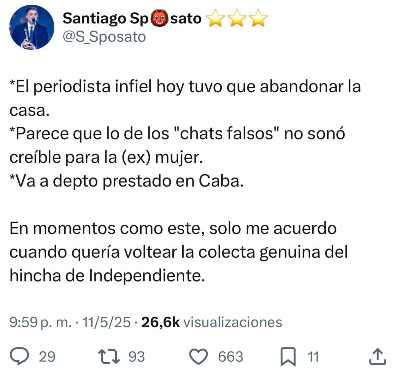 "Parece que lo de los 'chats falsos' no sonó creíble para la (ex) mujer. Va a depto prestado en CABA", añadió el movilero.