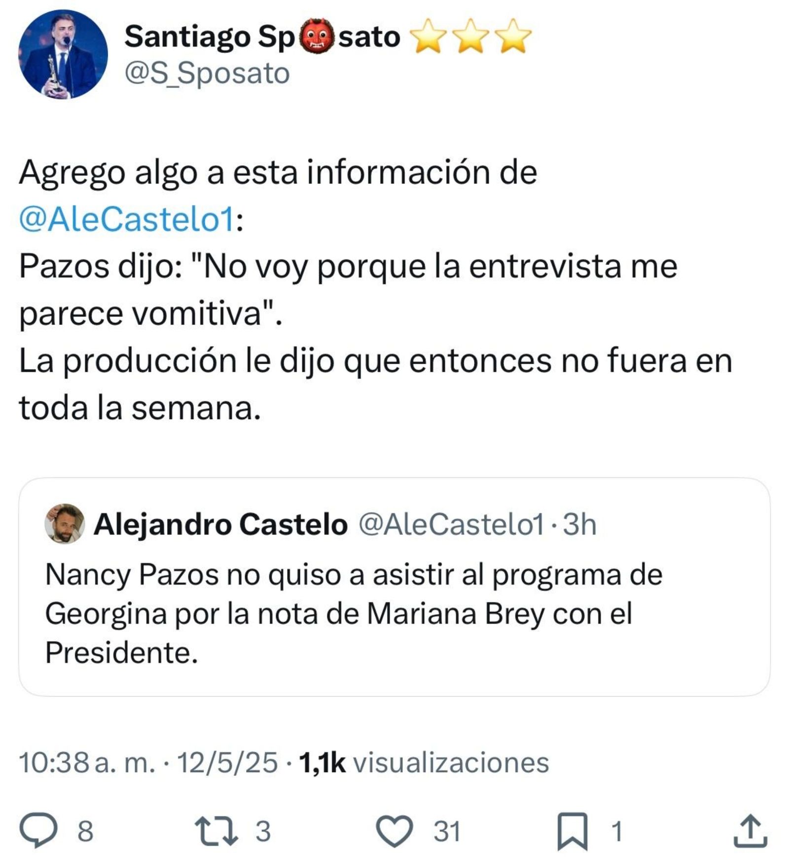 "Agrego algo a esta información de @AleCastelo1: Pazos dijo: 'No voy porque la entrevista me parece vomitiva'. La producción le dijo que entonces no fuera en toda la semana", comentó el movilero en la red social.