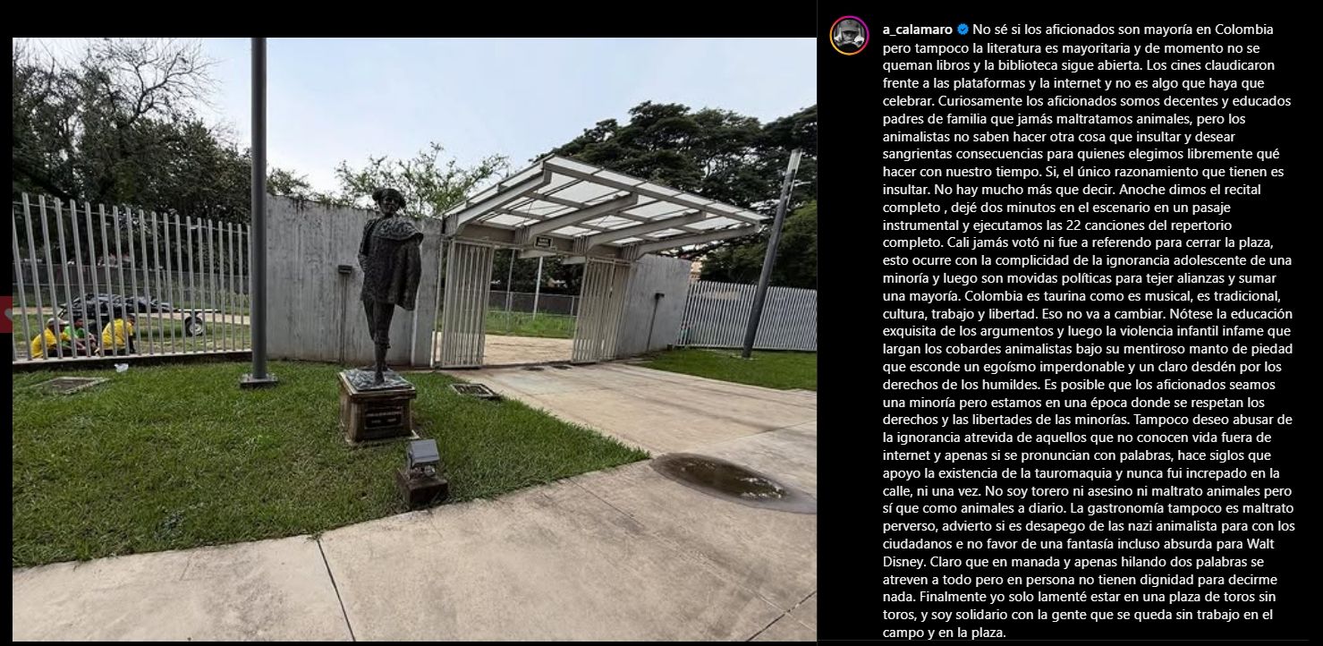El cantante continuó su descargo: "Curiosamente, los aficionados somos decentes y educados padres de familia que jamás maltratamos animales, pero los animalistas no saben hacer otra cosa que insultar y desear sangrientas consecuencias para quienes elegimos libremente qué hacer con nuestro tiempo. Sí, el único razonamiento que tienen es insultar. No hay mucho más que decir".