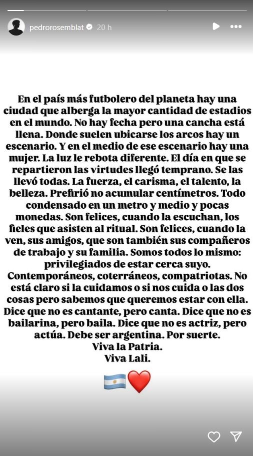 “Contemporáneos, coterráneos, compatriotas. No está claro si la cuidamos o si nos cuida o las dos cosas, pero sabemos que queremos estar con ella. Dice que no es cantante, pero canta. Dice que no es bailarina, pero baila. Dice que no es actriz, pero actúa. Debe ser argentina. Por suerte. Viva la Patria. Viva Lali”, cerró el emotivo mensaje, Rosemblat.
