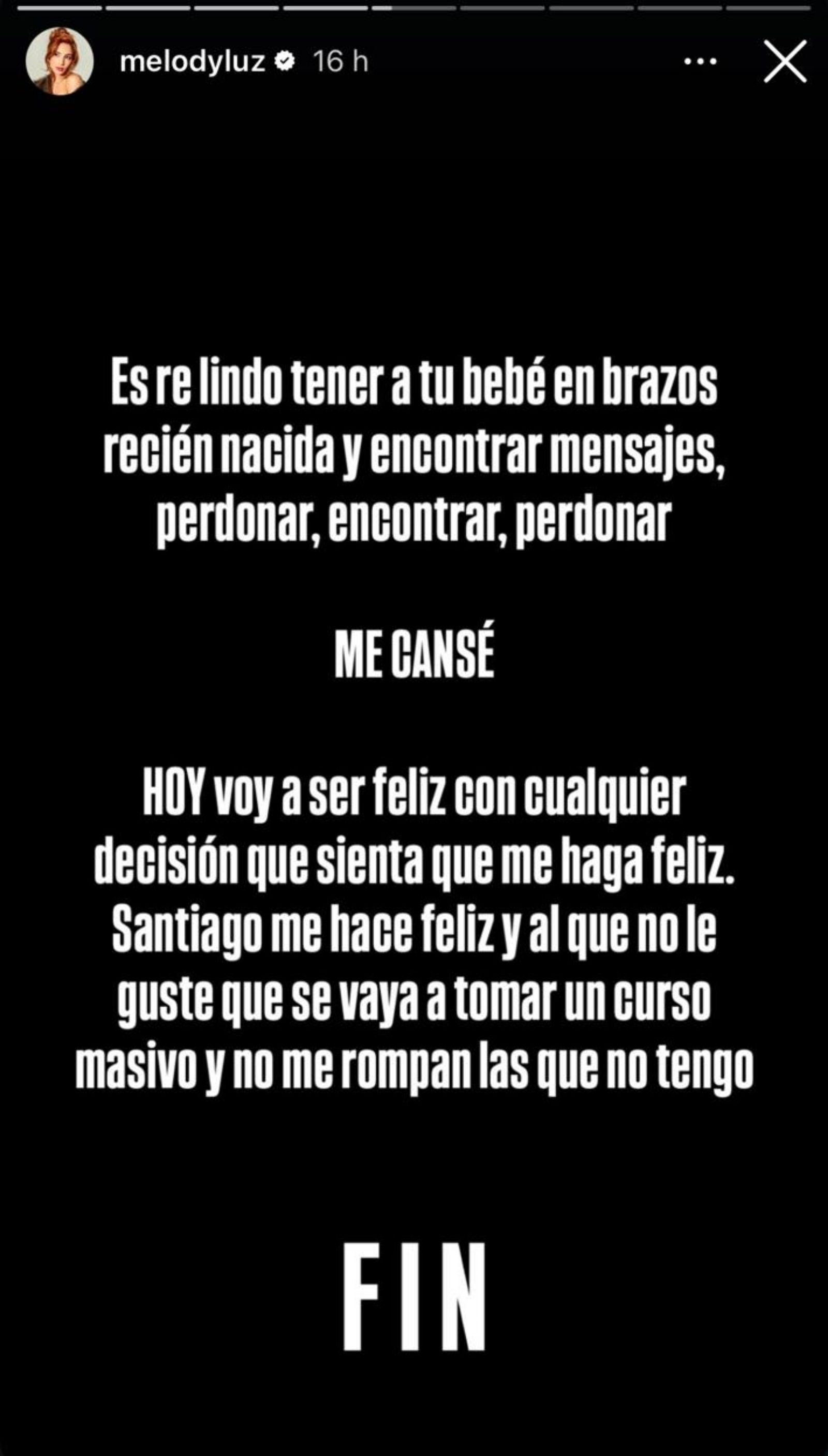 Tajante, continúa: "ME CANSÉ. HOY voy a ser feliz con cualquier decisión que sienta que me haga feliz". Además, confirmó su relación con el chef: " Santiago me hace feliz y al que no le guste que se vaya a tomar un curso masivo y no me rompan las que no tengo. FIN".