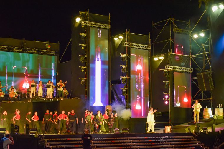 Pasadas las 22, el escenario se transformó para recibir a la obra “Alquimia del Malbec”. Bajo la mirada creativa de Pedro Marabini y Omar Escales, el show rindió tributo al esfuerzo rural y la epopeya del vino. Además, la narrativa visual y coreográfica capturó la esencia de la tierra en el marco de los 90 años de la Vendimia como hito provincial.