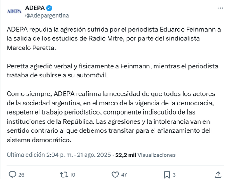 "ADEPA repudia la agresión sufrida por el periodista Eduardo Feinmann a la salida de los estudios de Radio Mitre, por parte del sindicalista Marcelo Peretta", expresaron en el inicio del escrito que publicaron en sus diferentes redes sociales luego de la agresión.