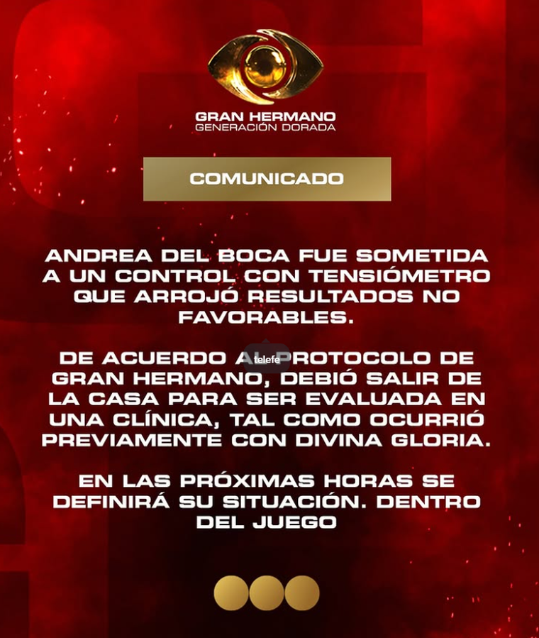 "Andrea del Boca fue sometida a un control con tensiómetro que arrojó resultados no favorables. De acuerdo al protocolo de Gran Hermano, debió salir de la casa para ser evaluada en una clínica", expresaron en la primera parte del escrito que publicaron en redes sociales.
