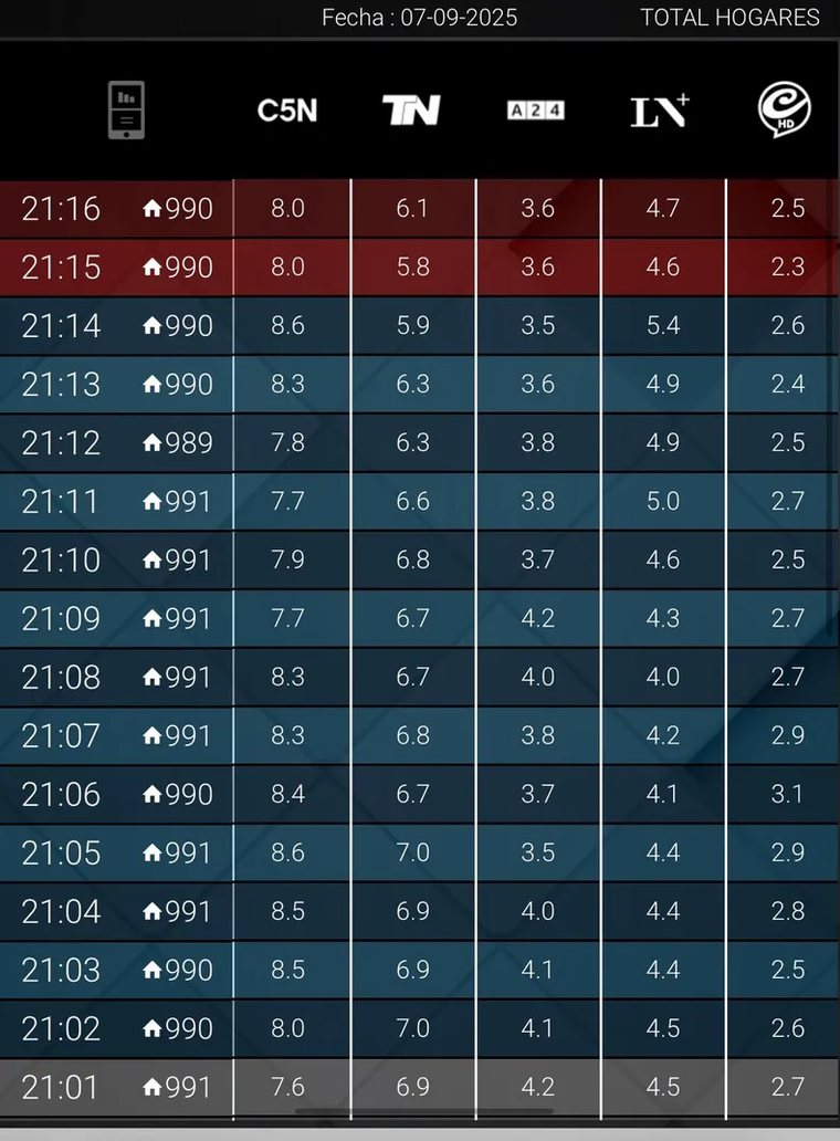Concretamente, según el reporte de Kantar Ibope, entre las 21:01 y las 21:16, C5N osciló entre 7.6 y 8.6 puntos de rating, mientras que en el mismo horario TN rondó entre 5.8 y 7.0. Durante ese cuarto de hora, LN+ logró marcas de entre 4.0 y 5.4 puntos de rating, seguido de cerca por A24 que orbitó entre 3.5 y 4.2.