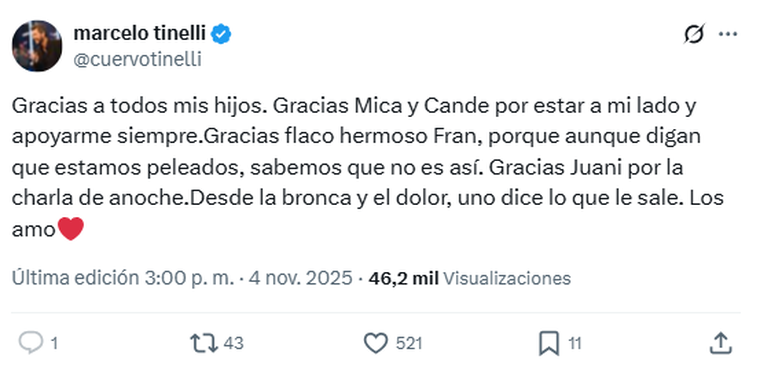 También le dedicó un párrafo a su hija Juanita: ""Gracias Juani, por la charla de anoche. Desde la bronca y el dolor, uno dice lo que le sale. Los amo".