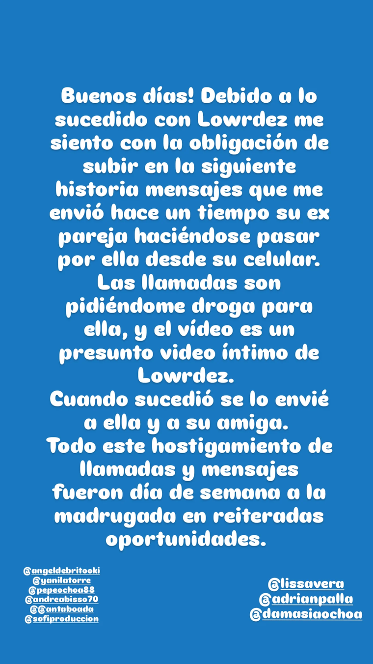 Además, agregó: "Las llamadas son pidiéndome droga para ella, y el video es un presunto video íntimo de Lowrdes. Cuando sucedió, se lo envié a ella y a su amiga. Todo este hostigamiento de llamadas y mensajes fueron día de semana a la madrugada en reiteradas oportunidades".
