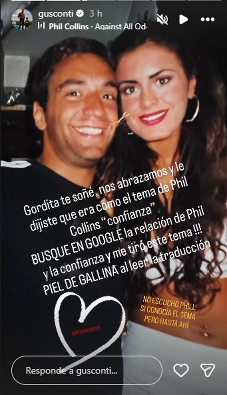 La publicación en Instagram no fue un simple recuerdo, sino la crónica de un encuentro onírico que dejó a Conti impactado. Acompañando una foto donde se los ve radiantes y cómplices, el actor detalló el diálogo que mantuvo con la "Gordita": “Gordita te soñé, nos abrazamos y dijiste que era como el tema de Phil Collins ‘confianza’. ¡Busqué la relación de Phil y la confianza y me tiró este tema! PIEL DE GALLINA al leer la traducción”.