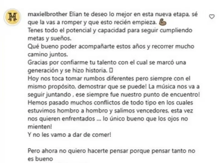 Del otro lado, la reacción fue expresada mediante un posteo difundida en sus perfiles digitales por el ahora exmánager del fenómeno musical. Maxi El Brother, quien acompañó al joven en su ascenso desde el año 2019, cuando sus comienzos eran más modestos, le dedicó palabras de aliento y buenos deseos para el futuro. “Elián, te deseo lo mejor en esta nueva etapa, sé que la vas a romper y que esto recién empieza. Tenés todo el potencial y capacidad para seguir cumpliendo metas y sueños", fue el inicio de su descargo.