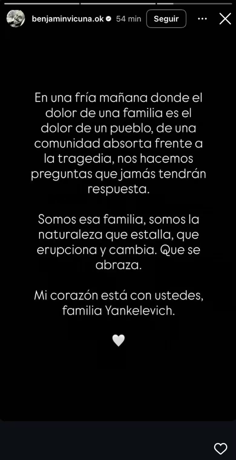 "En una fría mañana donde el dolor de una familia es el dolor de un pueblo… Mi corazón está con ustedes, familia Yankelevich. Somos esa familia, somos la naturaleza que estalla, que erupciona y cambia. Que se abraza.”, escribió el actor.