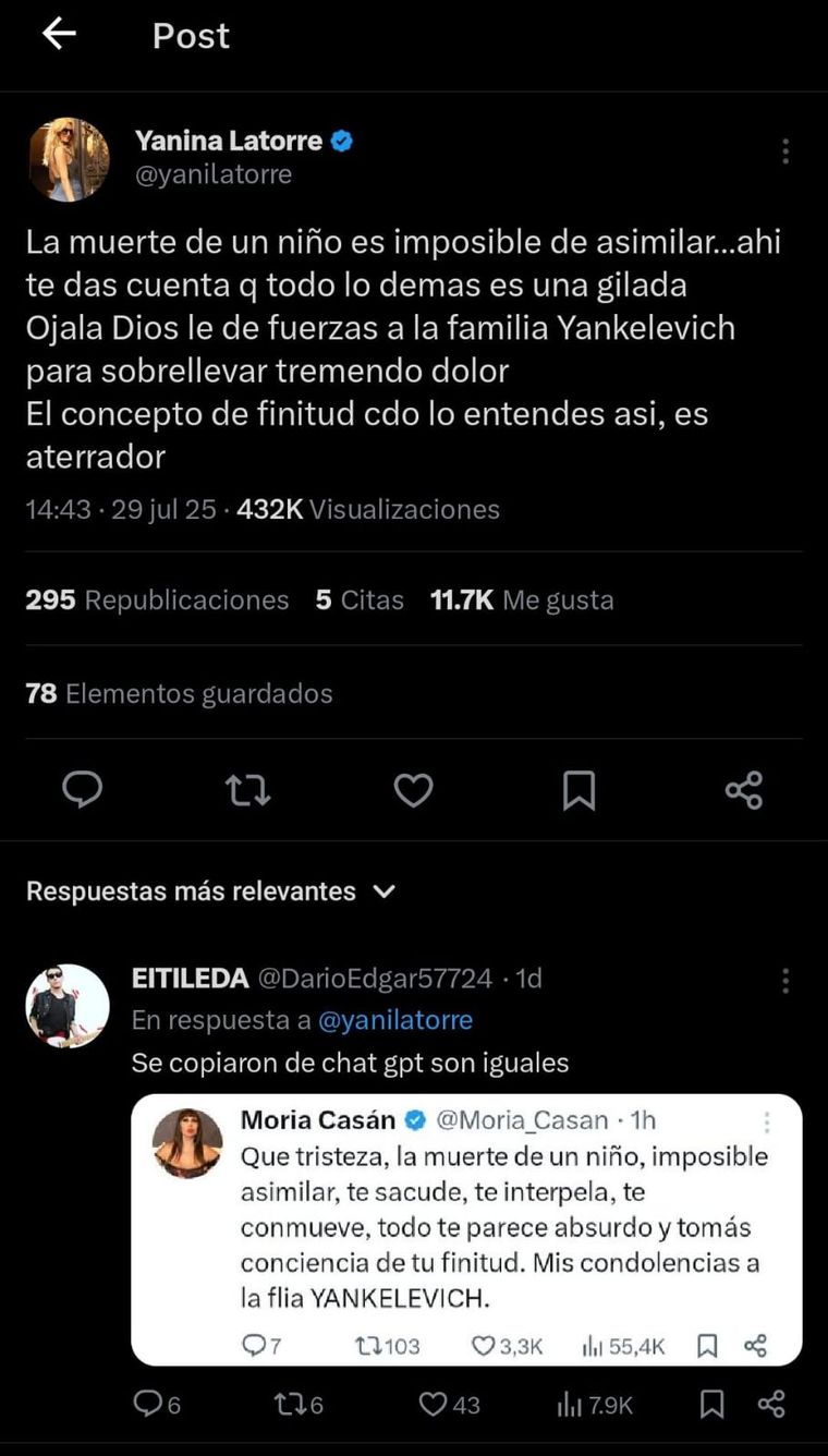 Como se dijo anteriormente, numerosos famosos hicieron uso de sus redes para expresar el dolor. Aunque no todos fueron bien vistos. Ese fue el caso de Yanina Latorre y Moria Casán, quienes se expresaron ante lo sucedido, pero un usuario hizo hincapié en un detalle que no fue perdonado.