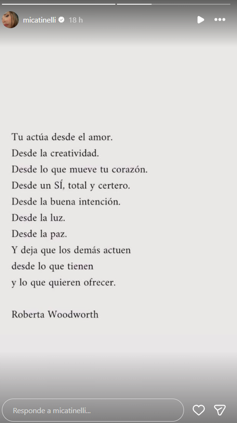 "Tú actúa desde el amor, desde la creatividad, desde lo que mueve el corazón, desde un sí, total y certero", expresaba la frase que subió a su Instagram. En el final, subrayó que "deja que los demás actúen desde lo que tienen y lo que quieren ofrecer".