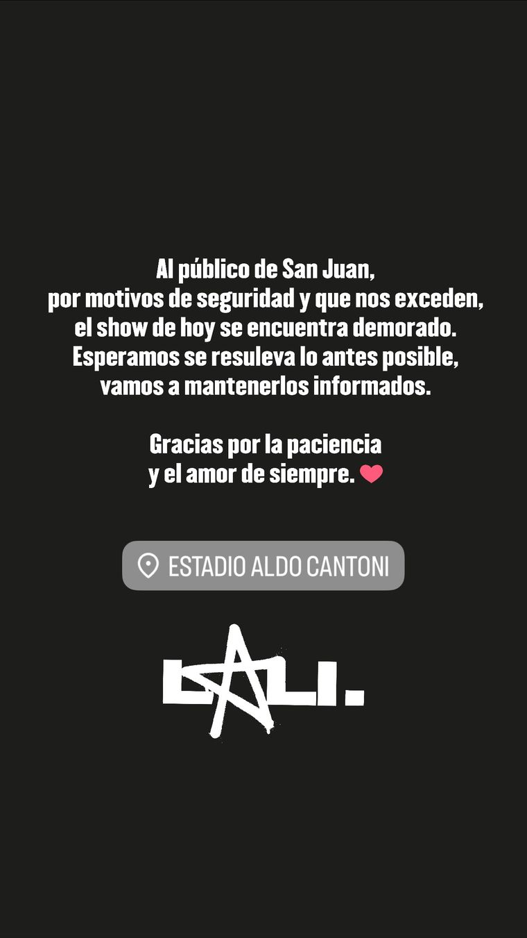 En tanto que desde sus redes sociales, Lali y su equipo expresaron: "Al público de San Juan, por motivos de seguridad y que nos exceden, el show de hoy se encuentra demorado. Esperamos se resuelva lo antes posible, vamos a mantenerlos informados".