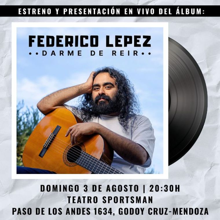 El músico mendocino presenta en vivo su primer álbum de estudio "Darme de Reír". Se trata de un trabajo que incluye canciones propias y algunas de otros/as autores/as. La esencia es el canto de raíz folklórica argentina específicamente el de la región cuyana. La cita será el domingo 3 de agosto a partir de las 20:30h en el mítico Teatro Sportsman de Godoy Cruz (Calle Paso de los Andes entre Pellegrini y Laprida, a pocos metros del límite entre Capital y Godoy Cruz) Al finalizar ésta presentación en vivo el álbum de lanzará en Spotify, YouTube, Apple Music y demás plataformas.