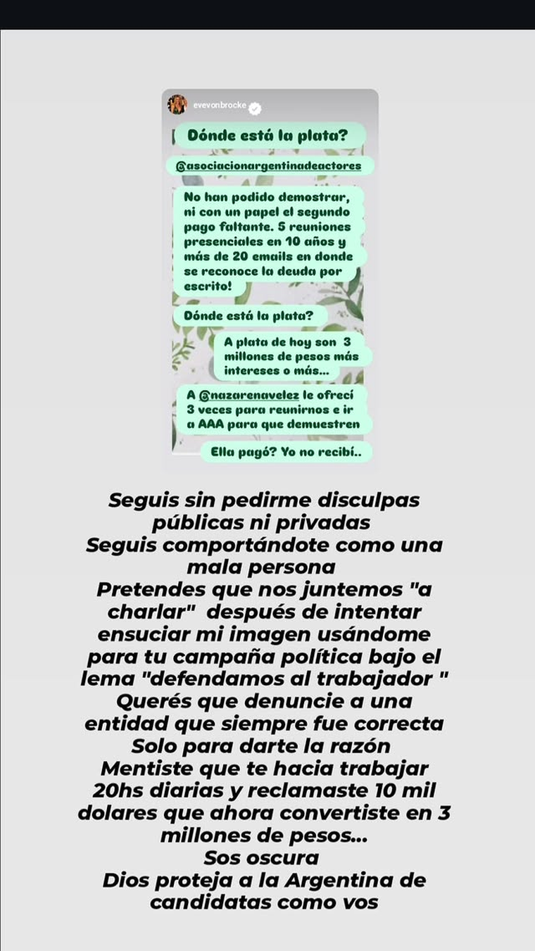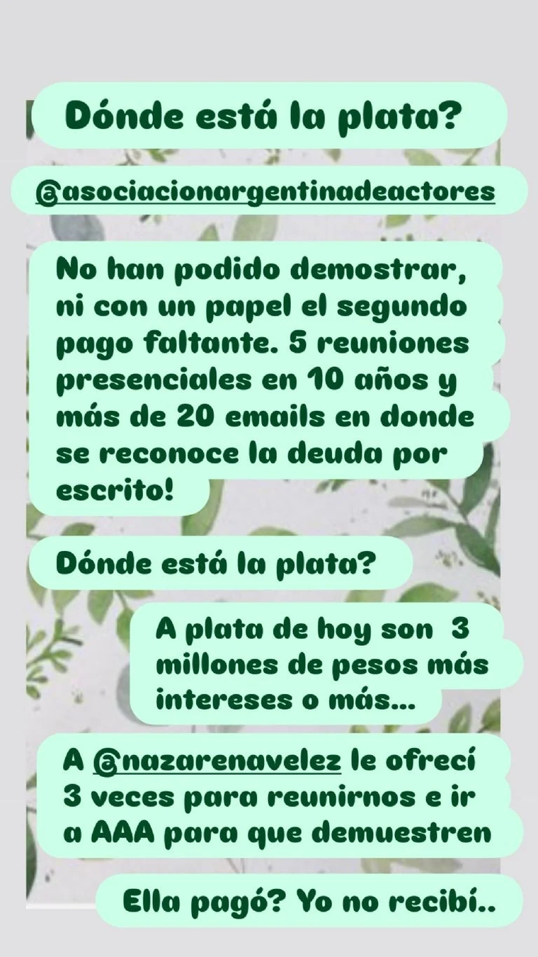 Además, compartió capturas de conversaciones con personas vinculadas a la Asociación, donde se hablaba de montos pendientes. En paralelo, advirtió que no seguirá discutiendo públicamente con Vélez: “Mañana continúa mi abogada con la Asociación Argentina de Actores.”