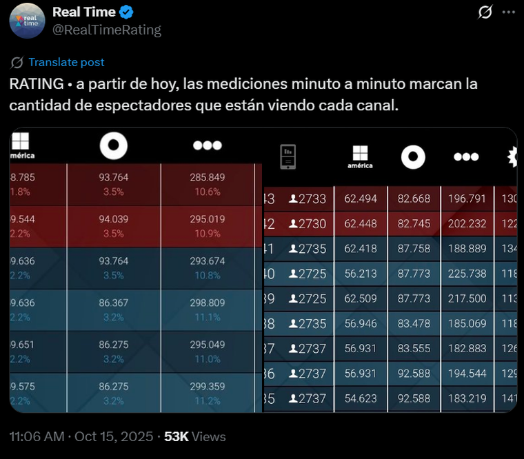 La novedad fue divulgada por la cuenta especializada en cifras de audiencia, Real Time Rating, a través de una publicación en la plataforma X (previamente conocida como Twitter). El mensaje textual que confirmó el cambio y puso en marcha este sistema fue: “A partir de hoy, las mediciones minuto a minuto marcan la cantidad de espectadores que están viendo cada canal”. La implementación de este formato brinda una perspectiva mucho más nítida y fidedigna acerca de la conducta de los consumidores de televisión abierta en el país.
