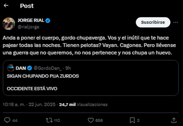 "El peor tipo de zurdo es el que banca a los cabeza de toalla por MIEDO a que nos bombardeen por "culpa" de que el Javo (Milei) tome posicionamiento moral en el conflicto mundial más importante del momento". Este tipo de mensajes fue lo que desató la ira de Jorge Rial, quien no dudó en salir al cruce con toda su furia.