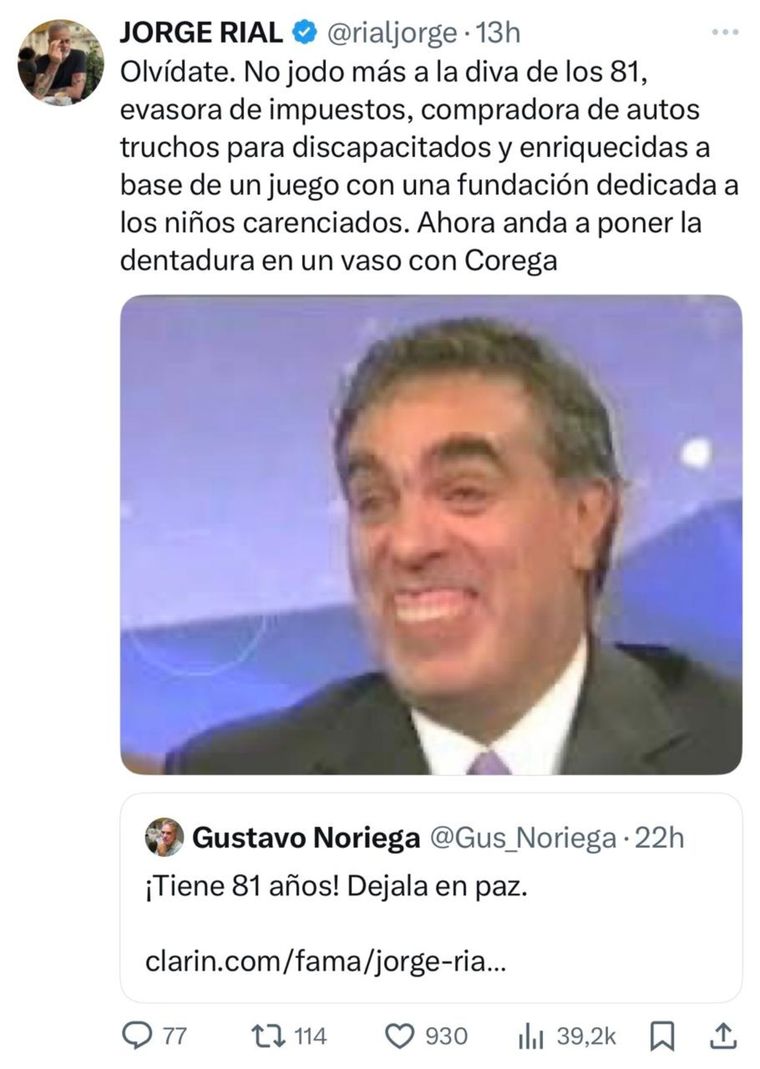 Lejos de suavizarse, Rial respondió nuevamente, ahora también contra Noriega: "Olvídate. No jodo más a la diva de los 81, evasora de impuestos, compradora de autos truchos para discapacitados y enriquecida a base de un juego con una fundación dedicada a los niños carenciados. Ahora anda a poner la dentadura en un vaso con Corega".