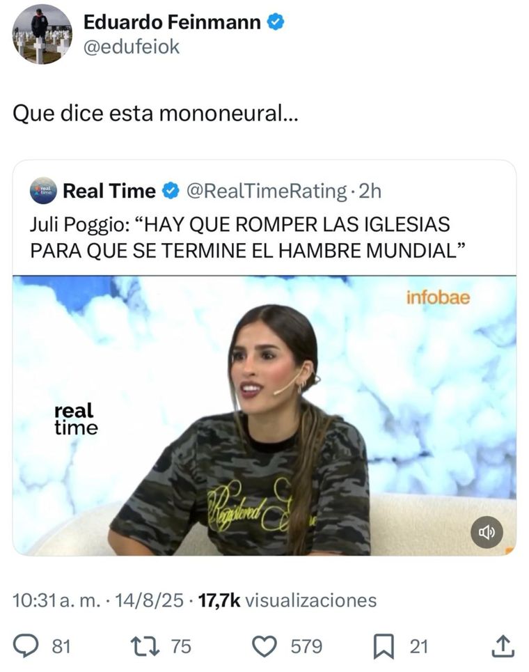 Finalmente, la actriz se refirió a los comentarios que recibió tras el escándalo, incluyendo una dura crítica del periodista Eduardo Feinmann. "No le conocía la cara a Feinmann hasta este momento, conocía el nombre, no la cara. No me afecta mucho, no lo conozco", dijo. También lamentó el tono de muchos mensajes en su contra. "Hubo muchos comentarios súper misóginos. Siempre está ese prejuicio sobre mí, capaz porque soy chica o no sé, yo la verdad lo superé y no me afectan esos comentarios, habla de cómo somos como sociedad y la gente más grande", cerró.