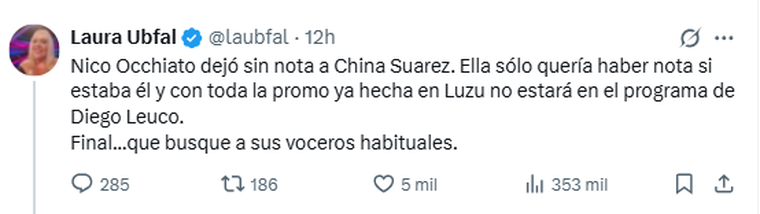 "Nico Occhiato dejó sin nota a China Suarez. Ella solo quería haber nota si estaba él y con toda la promo ya hecha en Luzu no estará en el programa de Diego Leuco", expresó la periodista en su cuenta de X (ex Twitter).