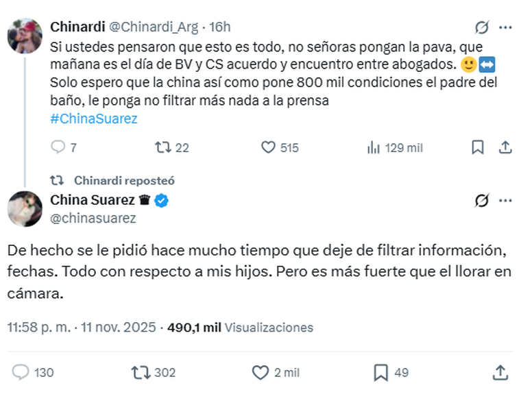 El mensaje aparece en medio de negociaciones sobre el régimen de visitas y la residencia de los niños, lo que añade gravedad al cruce. Una cuenta de X (ex Twitter) expresó: "Si ustedes pensaron que eso es todo, no señoras, pongan la pava, que mañana es el día de BV (Benjamín Vicuña) y CS ( China Suárez) y encuentro entre abogados".