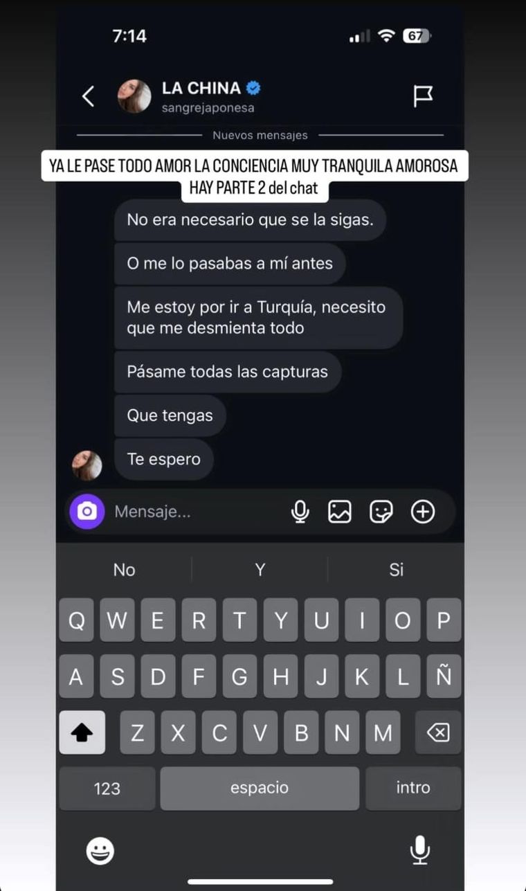 Sin embargo, el conflicto tomó un nuevo giro cuando La Cuerpo publicó en sus redes sociales lo que serían conversaciones privadas con la propia actriz. En las capturas difundidas, Suárez le habría solicitado: "Me estoy por ir a Turquía, necesito que me desmienta todo", a lo que sumó un reclamo por el manejo de la situación: "No era necesario que se la sigas, o me lo pasabas a mí antes".