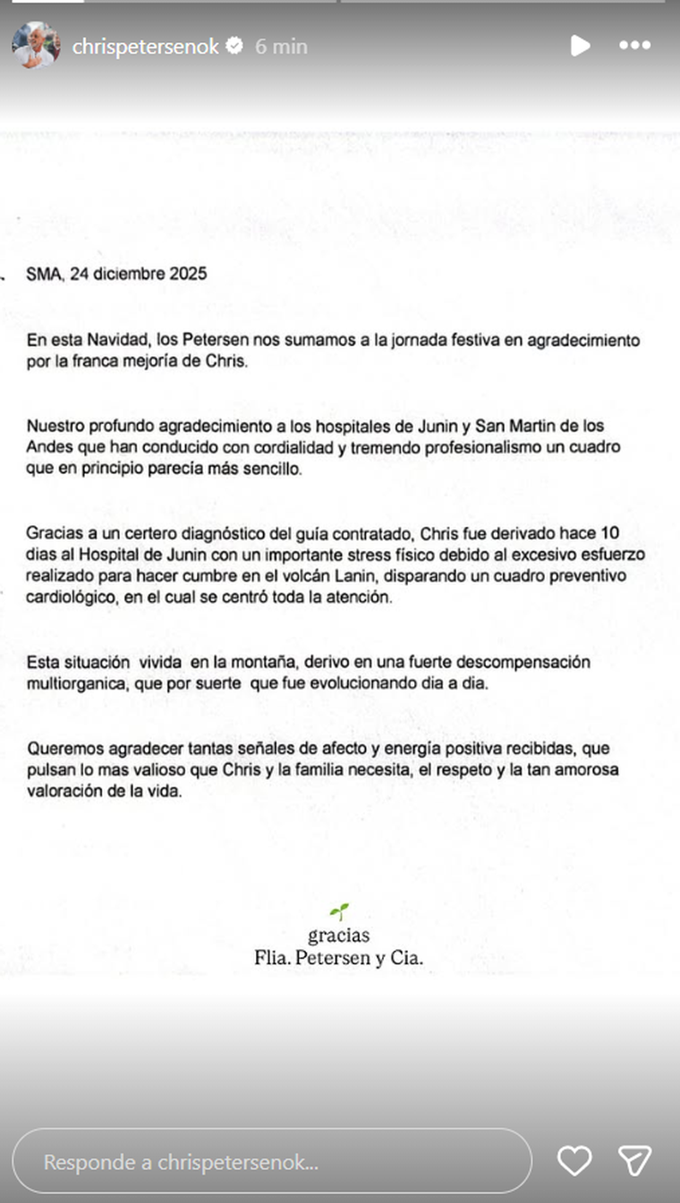 "En esta Navidad, los Petersen nos sumamos a la jornada festiva en agradecimiento por la franca mejoría de Chris", comenzaron escribiendo. También decidieron agradecerle al hospital de "Junín y San Martín de los Andes que han conducido con cordialidad y tremendo profesionalismo un cuadro que en principio parecía más sencillo".