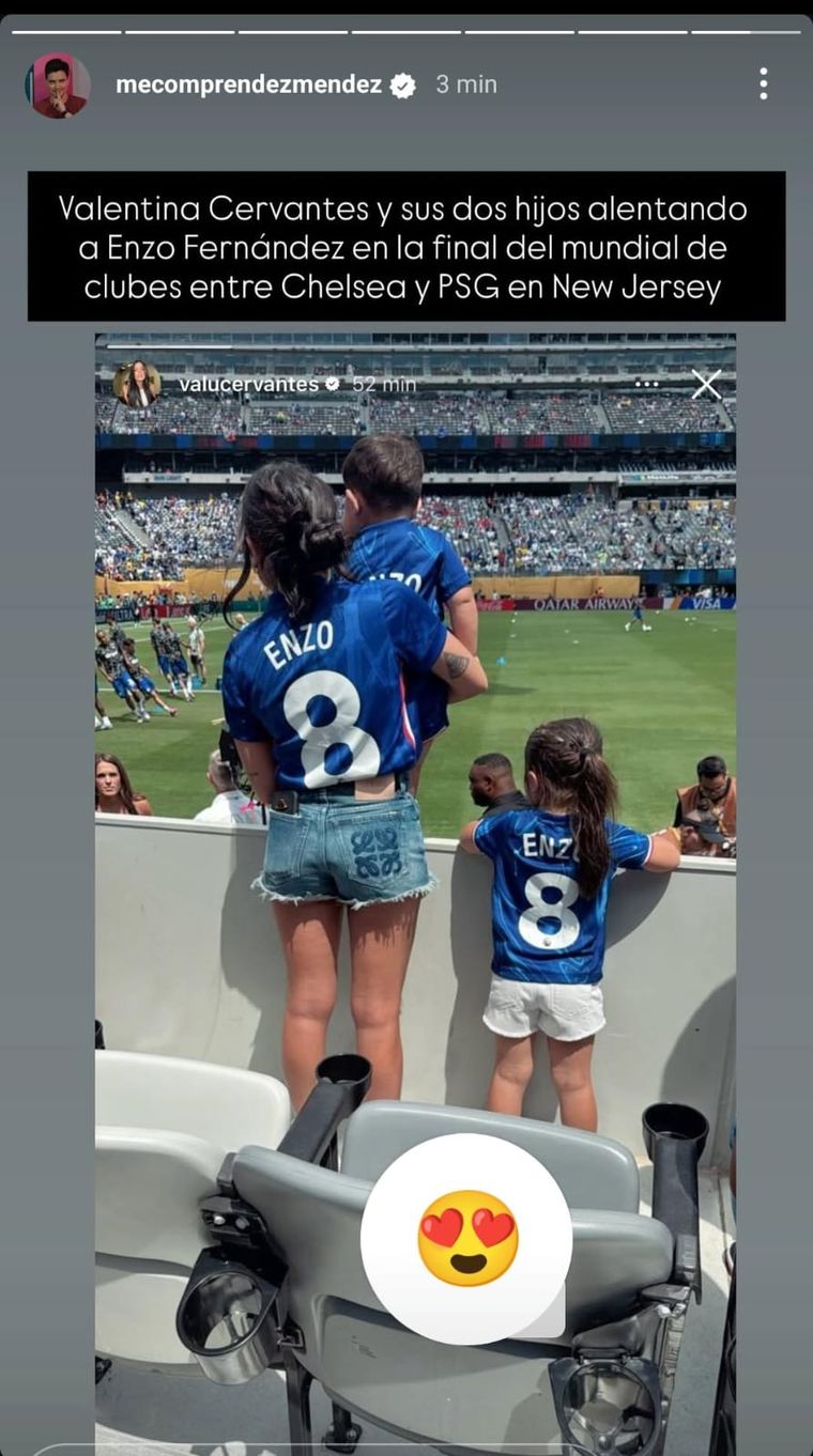 Gustavo Méndez replicó el momento y colocó como acompañamiento: "Valentina Cervantes y sus dos hijos alentando a Enzo Fernández en la final del mundial de clubes entre Chelsea y PSG en New Jersey".