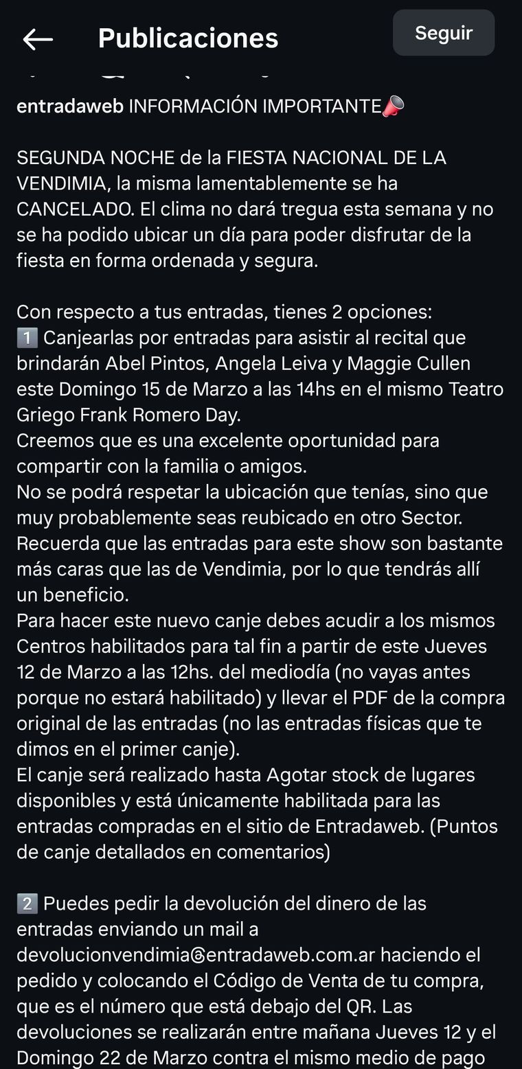 Para quienes opten por la música en vivo, las entradas podrán canjearse para asistir al recital de Abel Pintos, Angela Leiva y Maggie Cullen, que se llevará a cabo este domingo 15 de marzo a las 14:00 en el Teatro Griego Frank Romero Day. Es importante destacar que, aunque no se respetará la ubicación original de la entrada de la fiesta, los asistentes serán reubicados por sectores en un show cuyo valor de mercado es superior al de la Vendimia, lo que representa un beneficio económico directo para el usuario.