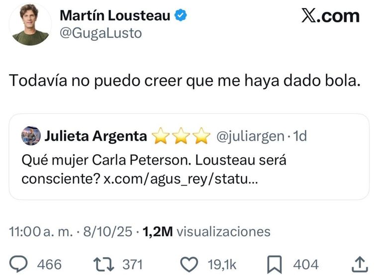 En X, un usuario compartió el clip y se volvió viral en la red social. La periodista Julieta Argenta lo resubió en su cuenta y escribió: "Qué mujer Carla Peterson. ¿Lousteau será consciente?