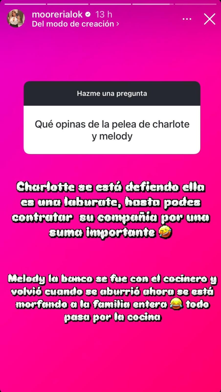 La mediática abrió la caja de preguntas y respuestas en su Instagram y fue consultada por un usuario. La joven respondió contundente y opinó sobre ambas caras de la moneda: "Charlotte se está defendiendo, ella es una laburante, hasta podés contratar su compañía por una suma importante".