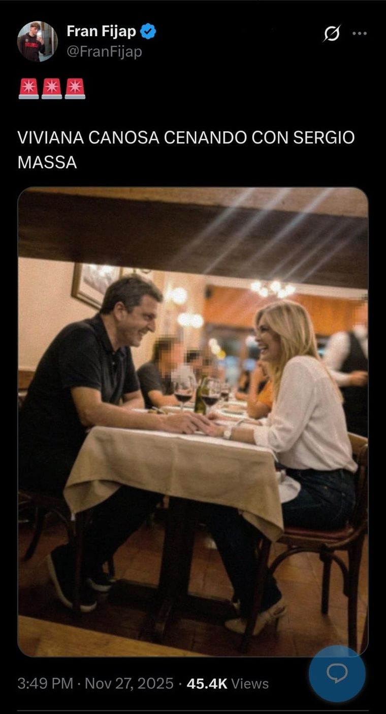 El posteo que hizo el usuario @FranFijap dice: "Viviana Canosa cenando con Sergio Massa". La publicación del joven libertario se llenó de comentarios que liquidaron a la conductora y no tardó en viralizarse.