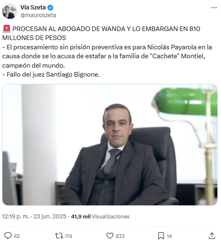 El periodista de policiales, Mauro Szeta compartió en sus redes sociales la noticia: "Procesan al abogado de Wanda Nara y lo embargan en 810 millones de pesos", comenzó informando el comunicador, que supo estar en el noticiero del mediodía en Telefe.