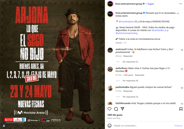 Ricardo Arjona causó furor luego de anunciar sus shows en Argentina y los fanáticos agotaron rápidamente los ticketes. El cantante guatemalteco, logró en tiempo récord agotar 8 fechas en el estadio Movistar Arena de Buenos Aires y en las últimas horas compartió un noticia que alegrará a sus fans.